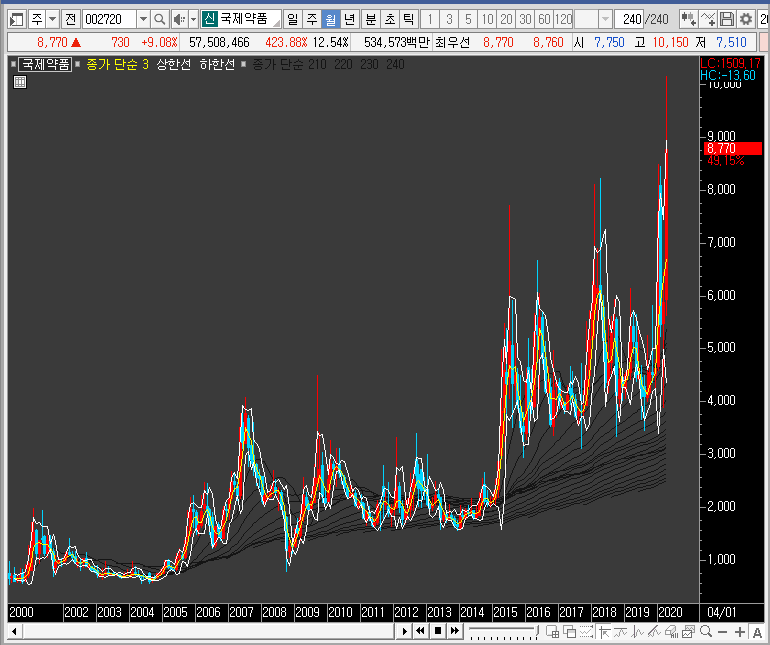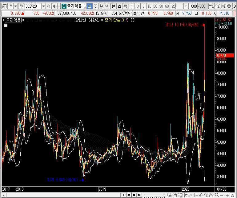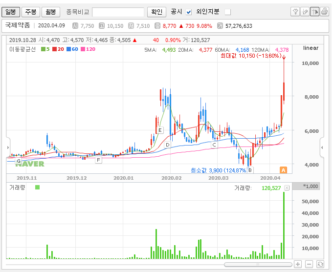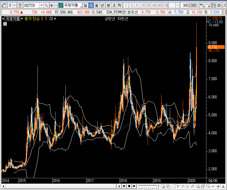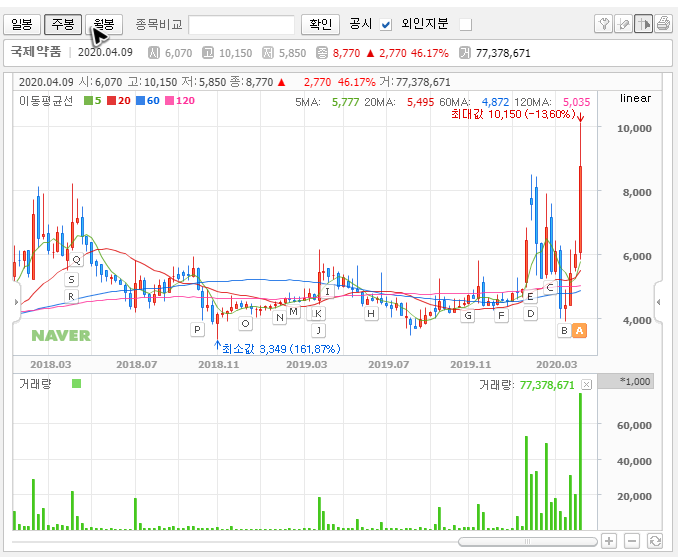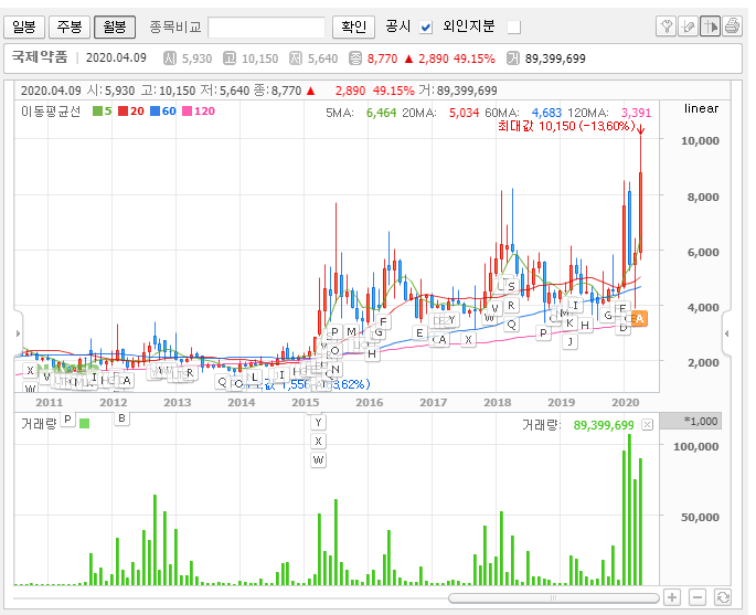 신기하게도 월봉을 보면 국제약품의 주가는 상장한 이후부터 꾸준하게 상승추세를 유지하고 있습니다. 지금은 신고가를 만들었죠. 아무래도 제가 모르는 부분이 있는 듯합니다.