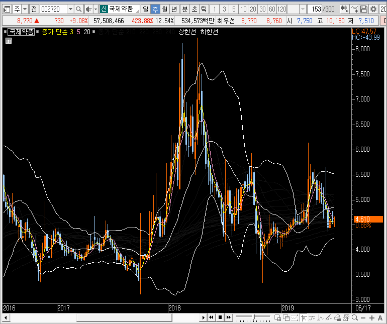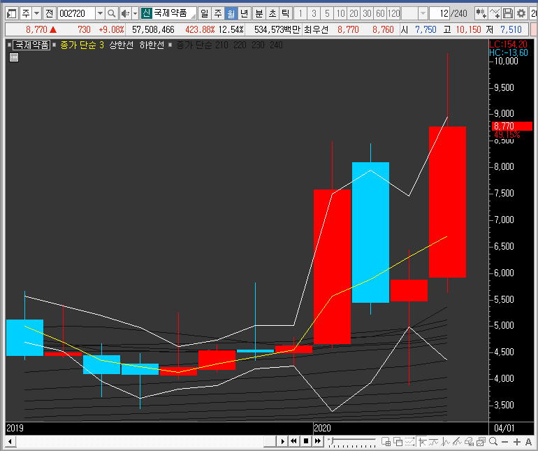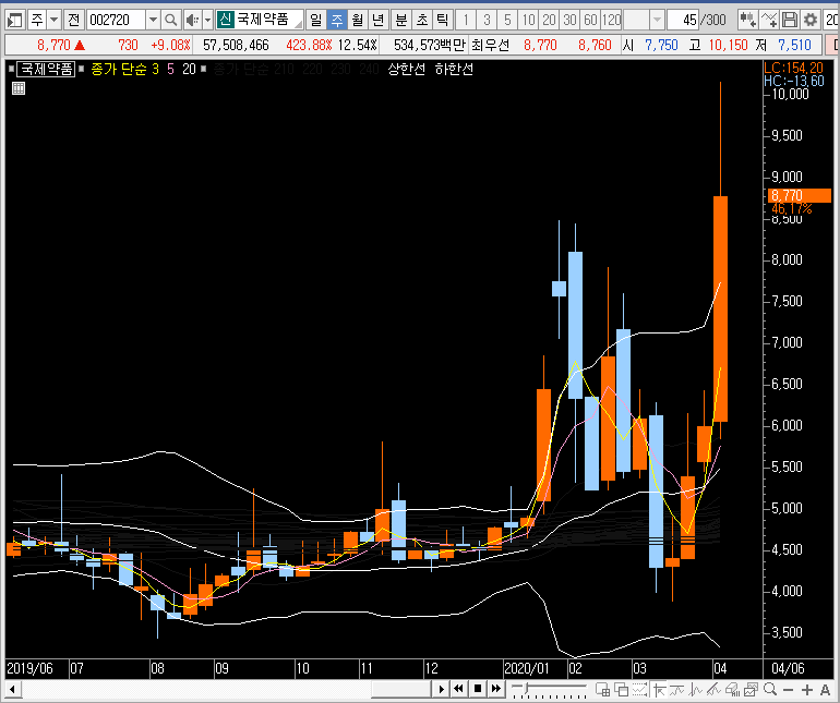 주봉차트를 보면 역시나 밴드 확장 모습이 나오는데, 이런 패턴의 경우 가파른 단기선을 눌림으로 사용할 확률이 높습니다. 즉, 단기선까지 국제약품의 주가가 내려오고 단기선 각이 가파르면 공략해볼 수 있을 듯합니다.