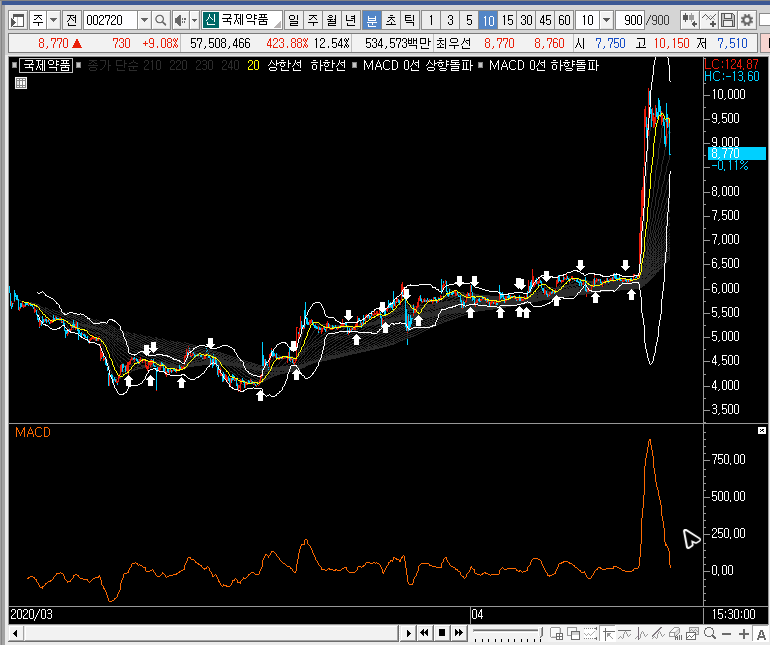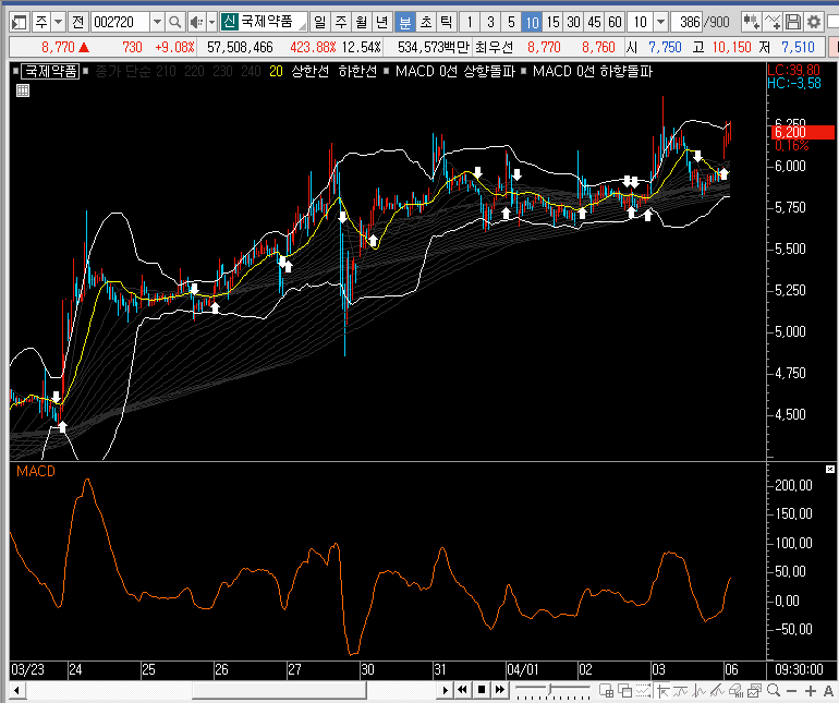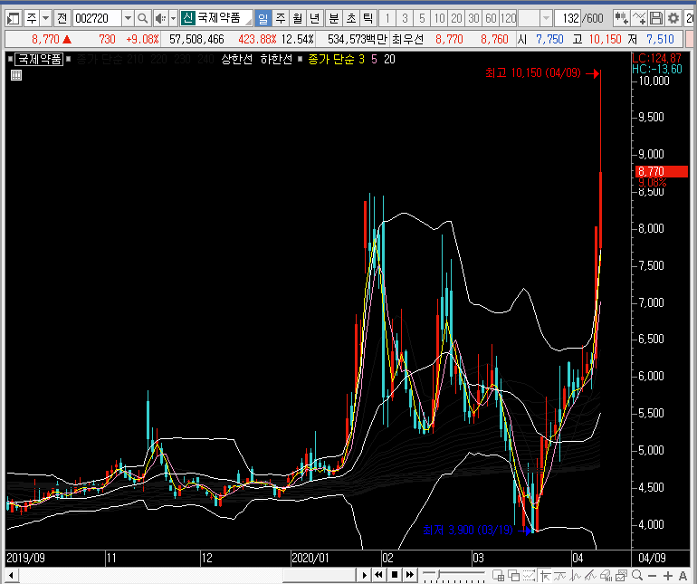 차트를 줄여서 보면 깔끔하게 수축된 밴드 하단선을 지지하고 오르는 국제약품의 주가를 볼 수 있는데, 밴드 하단선에 이 종목을 봤었다면 충분히 기회를 잡을 수 있었을 것 같다는 생각에 아쉬움이 느는군요.