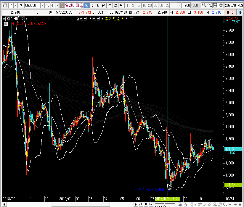 주봉차트를 보면 일신바이오의 주가가 그물망을 뚫는 모습이 보여지는데, 단기선은 아직 중심선도 넘지 못하고 있습니다. 지금부터 예상할 수 있는 흐름은 크게 세 가지일 것입니다.