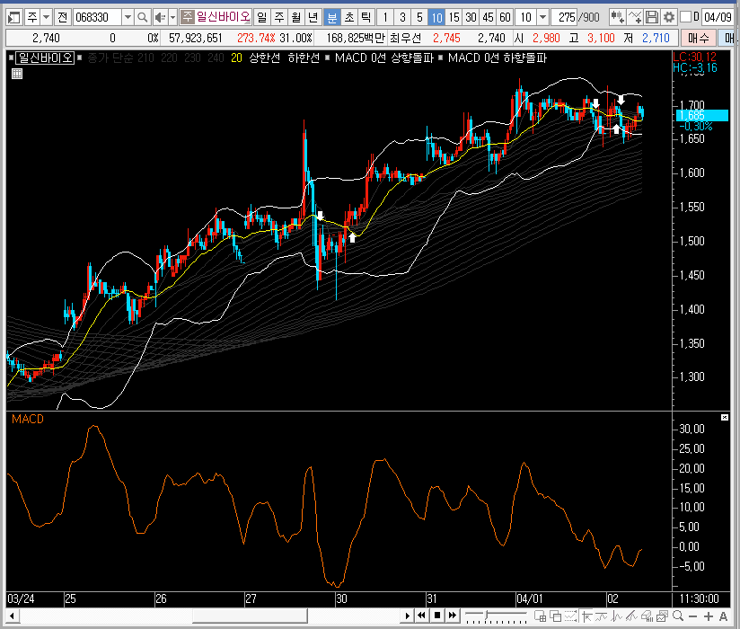 그래서 저는 일신바이오 주가가 단기선까지 내려오거나, 횡보하면서 단기선이 올라왔을 때의 순간을 공략할 것 같습니다. 분봉에서 지지력을 확인하고 진입하되 손절을 짧게 잡고 시세차익에도 욕심을 부리지 않을 것 같습니다.