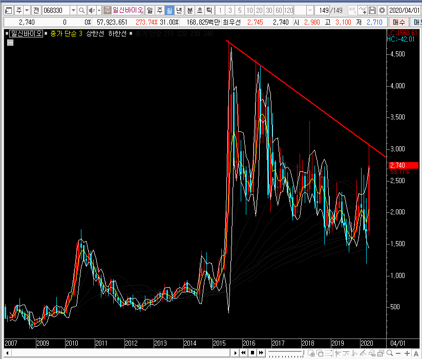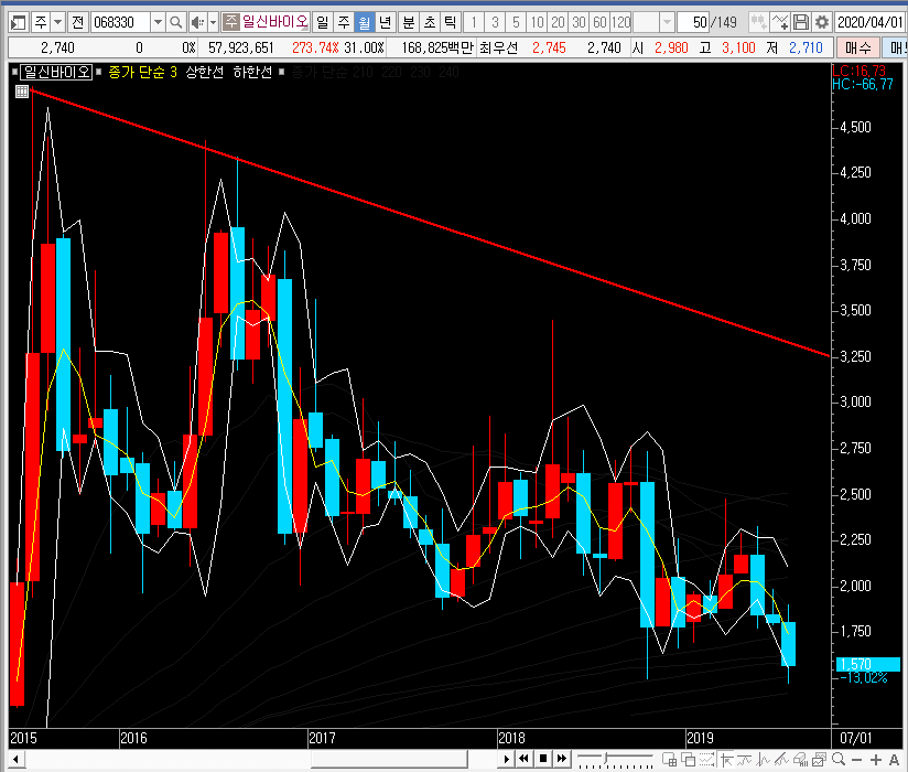 월봉차트로 일신바이오의 주가를 보면 하락하는 추세에 있으며, 특별히 저항선을 넘는 모습이 보이지 않습니다. 재료가 좋다면, 그리고 연달하 좋은 소식이 전해진다면 이 저항선을 넘는 흐름이 나올지도 모르겠습니다.