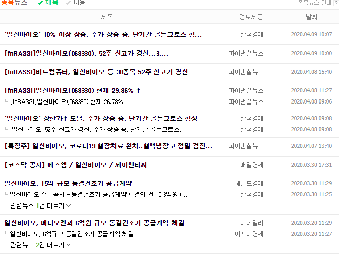 각설하고, 지금부터 일신바이오의 주가에 대해 얘기를 해보겠습니다. 몇 가지 소식들이 있지만 역시나 지금 가장 강한 영향력을 주는 재료는 서두에 언급을 했었던 완치소식이 아닐까 합니다.