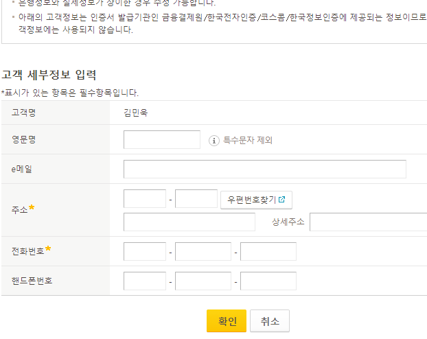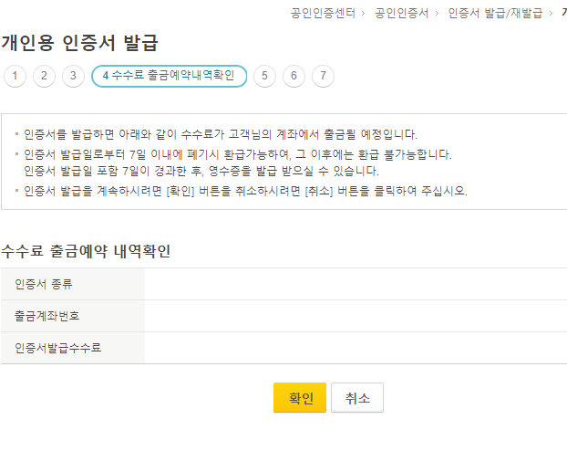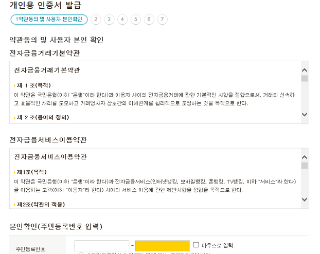 총 일곱 단계를 진행해야 국민은행 공인인증서를 재발급을 할 수 있는데, 앞서 언급했듯이 그냥 빈칸을 채우면서 적당히 다음 단계를 넘어가는 것이 전부라 지금부터는 제가 특별히 설명할 내용이 없을 것 같아요.