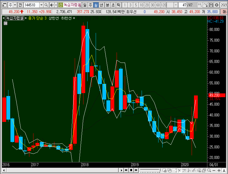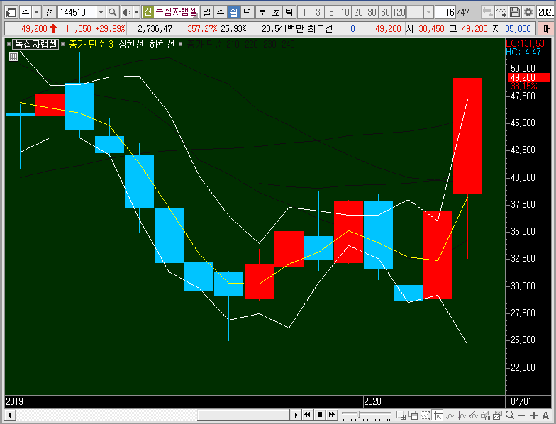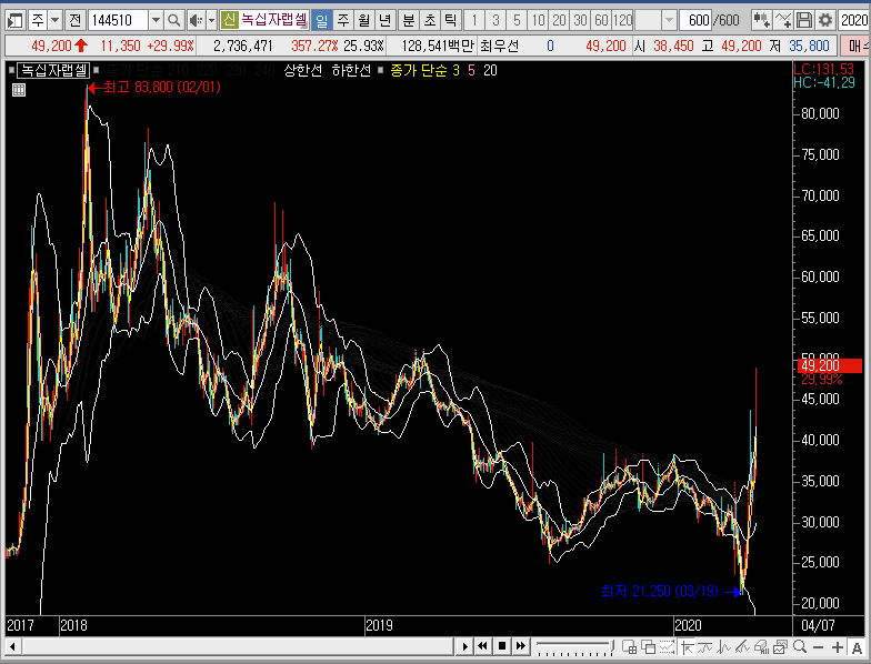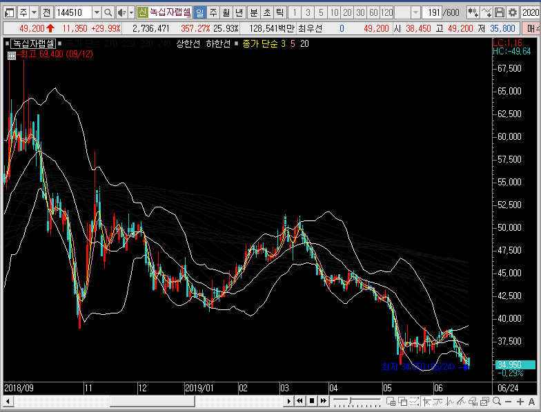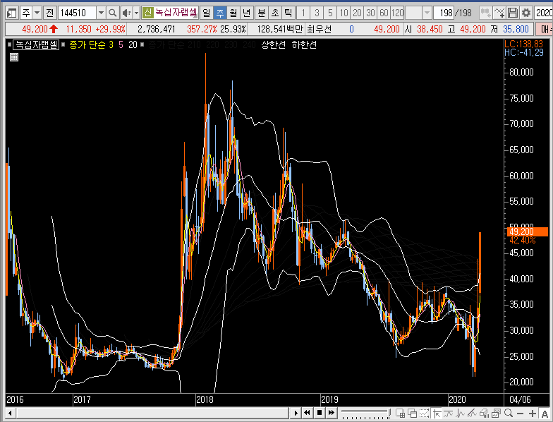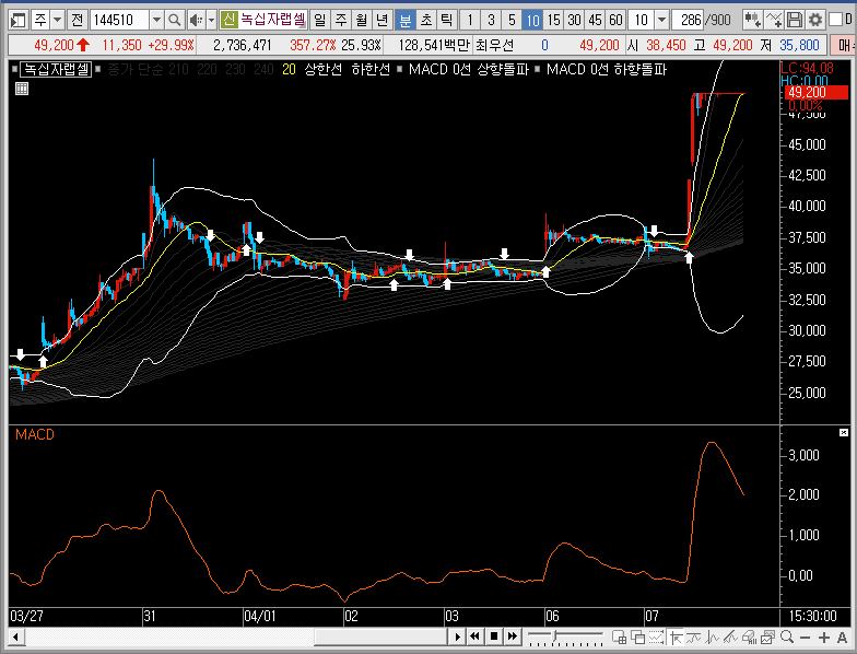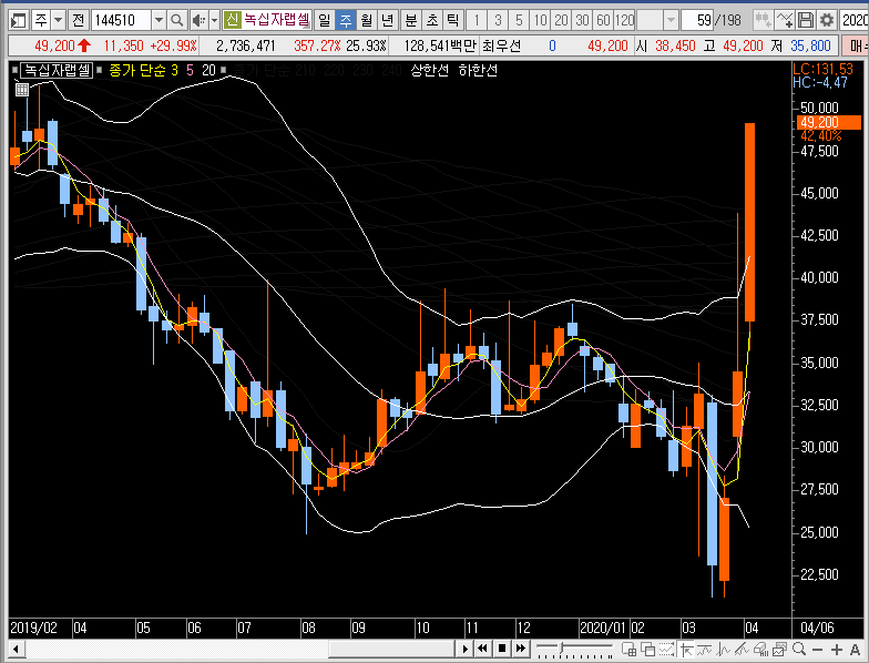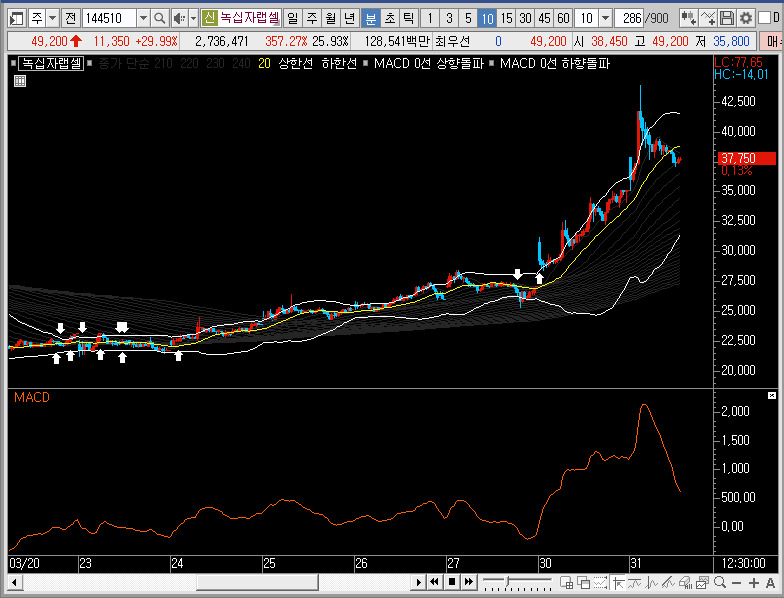 주봉차트에서는 밴드를 확장시키는 동시에 그물망까지 뚫어버리는 모습이 나왔으니, 단기적인 관점으로 3일선이나 5일선까지 녹십자랩셀의 주가가 눌림이 들어올 때 지지력을 확인하고 따라붙어 보는 것도 나쁘지 않을 듯합니다.
