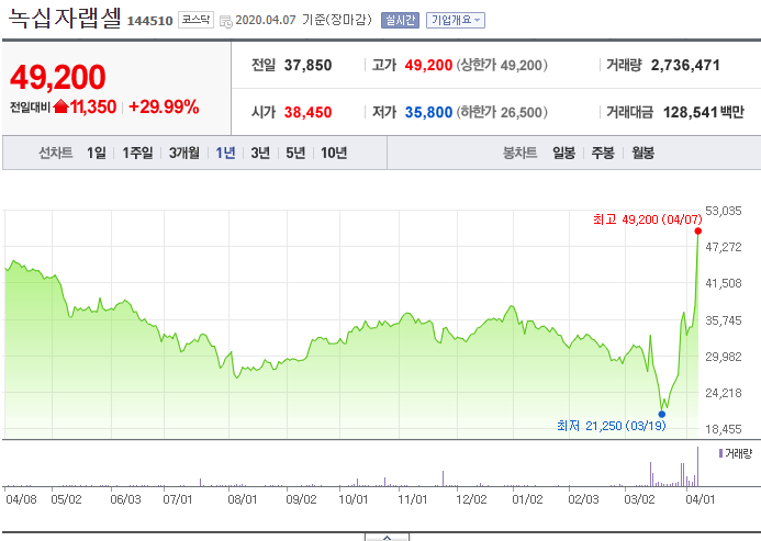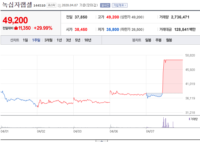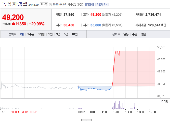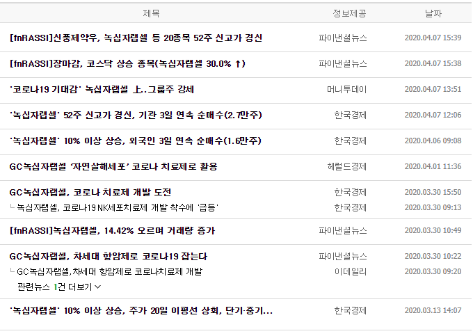 각설하고, 이제 녹십자랩셀의 주가에 대해 얘기를 해보겠습니다. 잘 아시겠지만, 며칠 전에도 이 종목은 상한가를 찍었습니다. 그리고 오늘 또 다시 상한가를 찍었는데, 뉴스를 보면 두 날 모두 같은 재료로 상을 띄웠습니다.