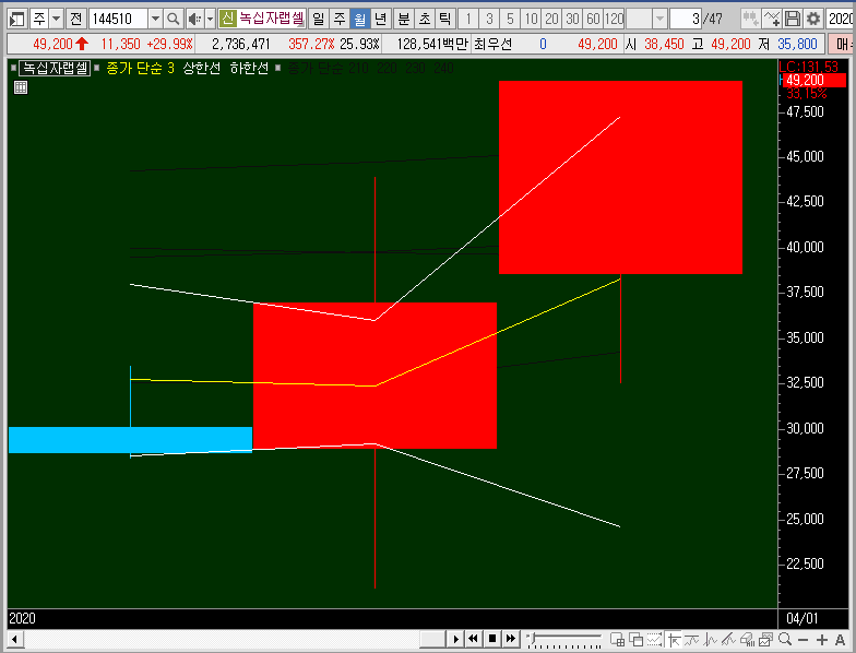 그럼에도 월봉차트는 작은 횡보 구간을 거친 뒤에 그 구간을 이제 막 뚫은 양봉이 나왔으니, 이번달은 양봉마감을 하는 녹십자랩셀의 주가가 될 확률이 높습니다.