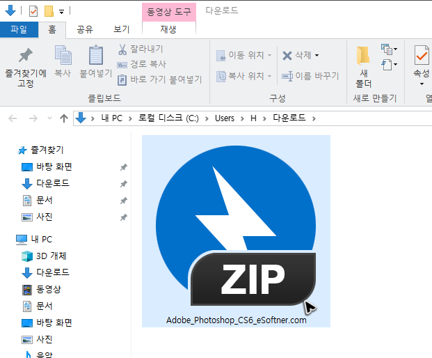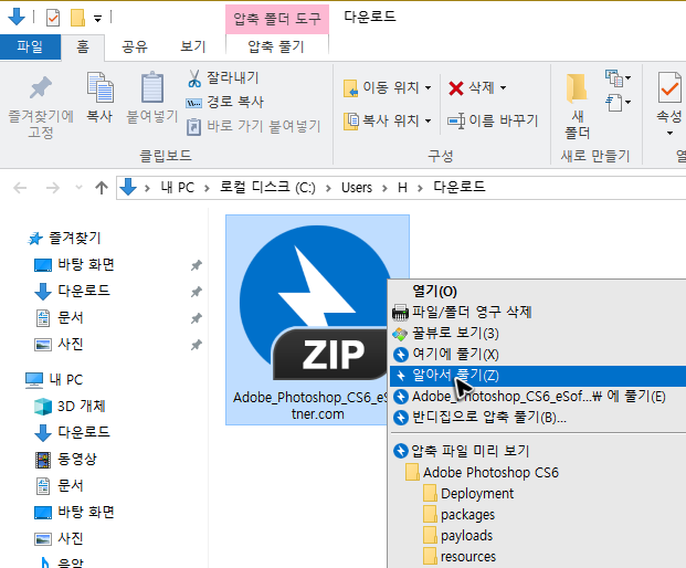 저처럼 CS6을 선택해서 포토샵 무료를 다운하면 아래 그림처럼 압축된 파일이 받아질 거예요. 모두 다 받은 뒤에는 압축을 풀어주면 됩니다. 압축 해제 과정은 우 클릭을 해서 메뉴를 누르면 되니, 따로 설명하지 않아도 괜찮겠죠?