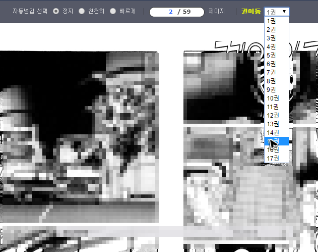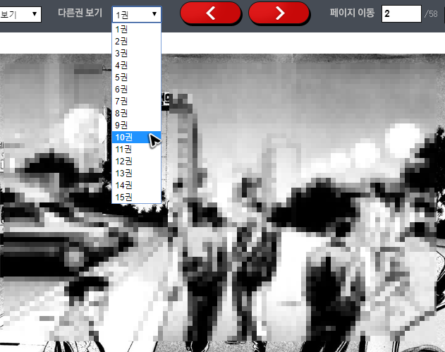 약속이라도 한 것 처럼 무료 만화의 사이트 구성은 다 비슷합니다. 여기에서도 그림을 클릭해서 다음장으로 넘길 수 있고, 네비게이션으로 다음권을 읽으러 이동할 수 있습니다.