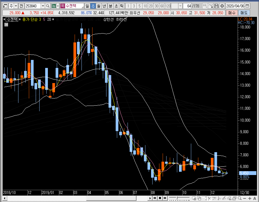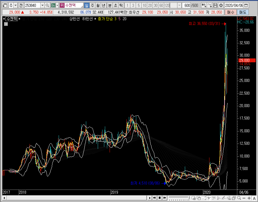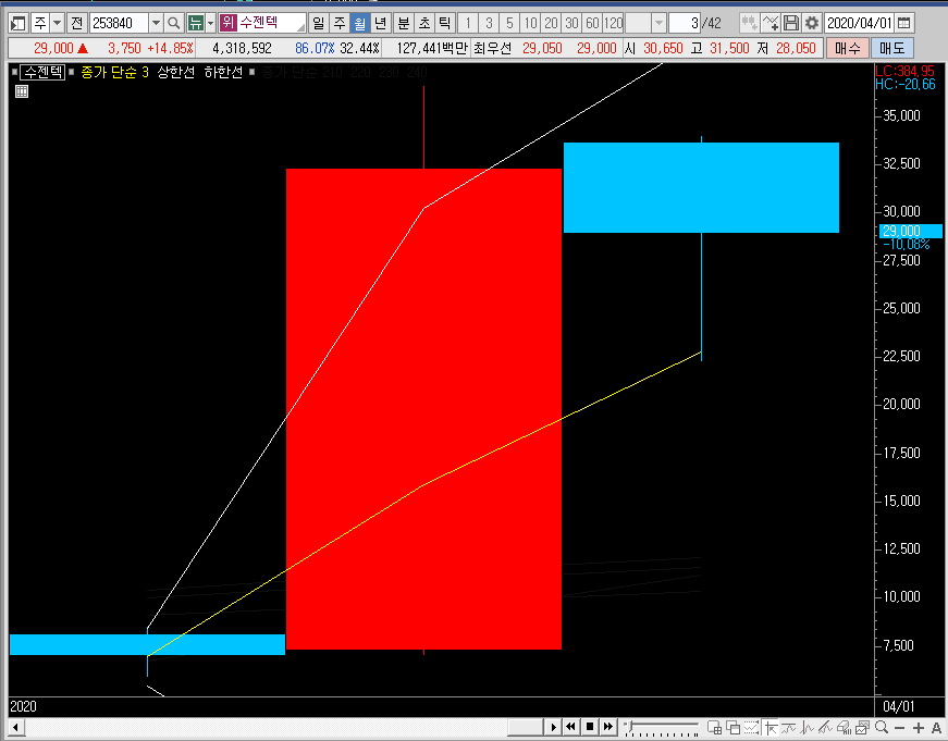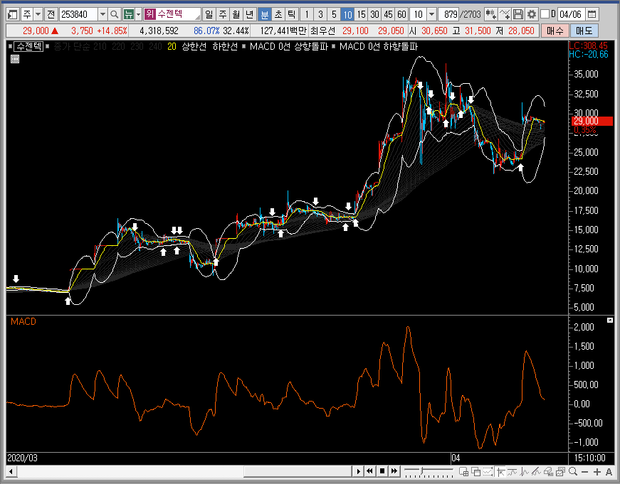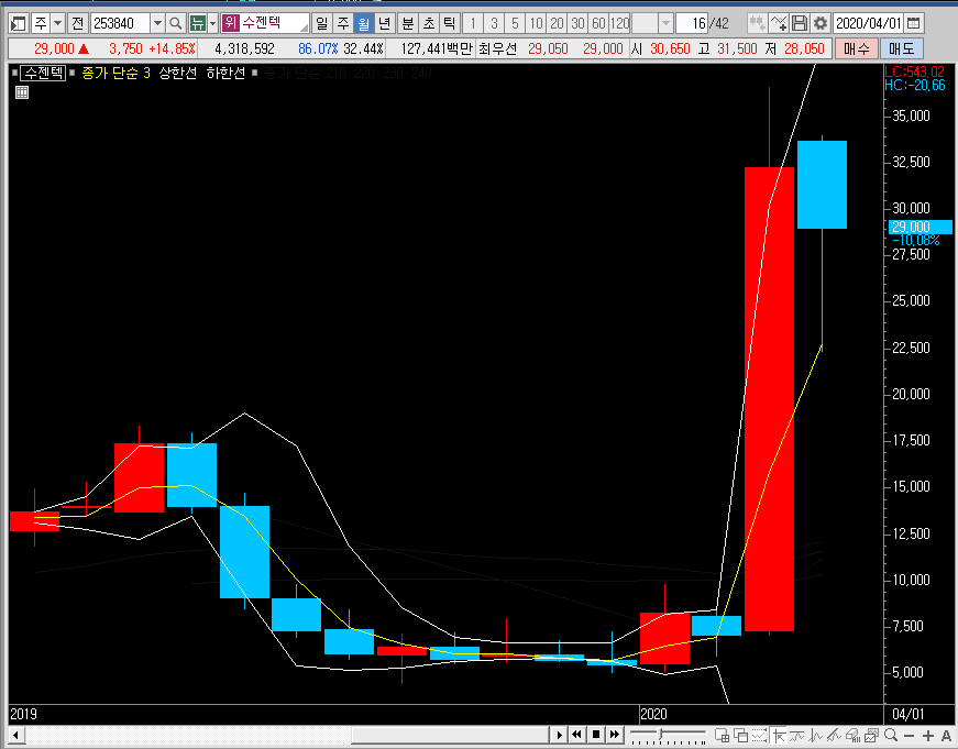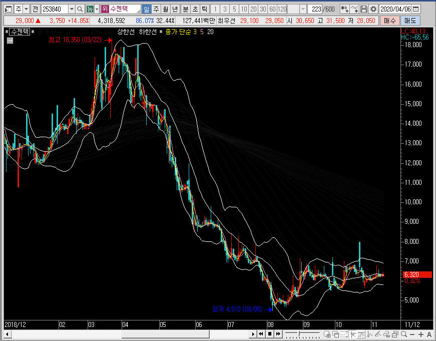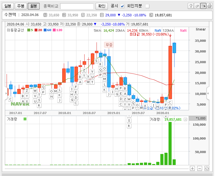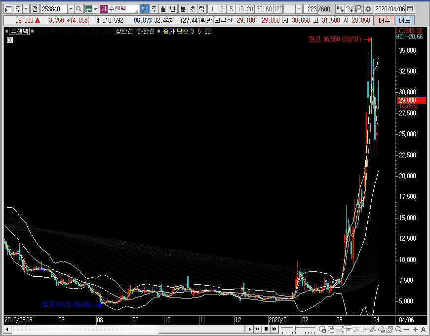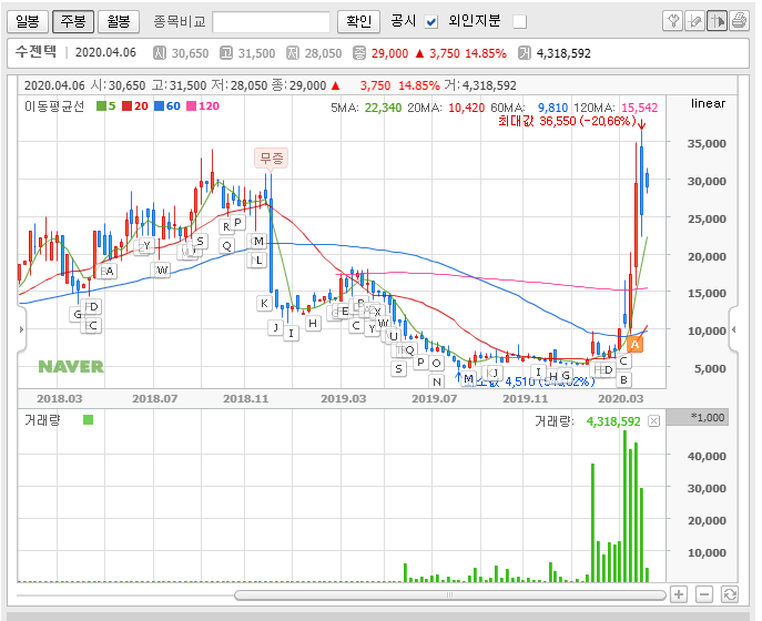 월봉차트를 보면 하락하고 몇 달동안 횡보를 한 뒤에 변동성을 키우더니 갑자기 지금의 상승파가 나온 것을 알 수 있습니다. 즉, 안목이 있으셨던 분들이라면 횡보구간이나 횡보구간 상단이 뚫릴 때 수젠텍의 주가를 공략하셨을 것입니다.