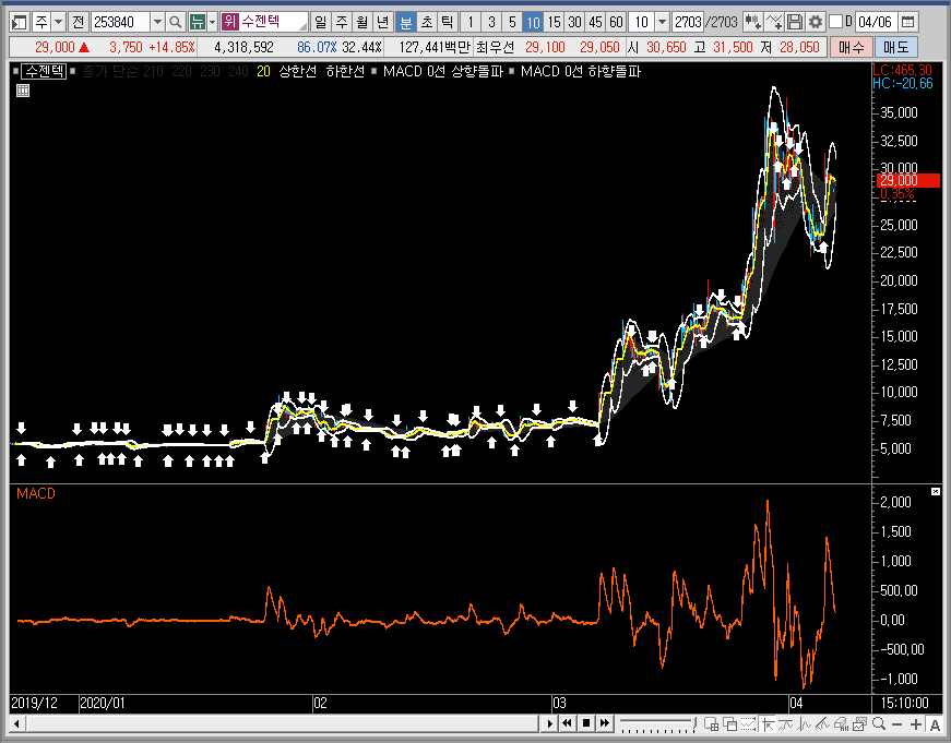 일봉이나 분봉을 봐도 지금 자리는 나오고 있는데, 앞에서 언급을 했듯이 지금 수젠텍의 주가를 공략하는 것은 큰 위험부담을 해야 하고, 기대할 수 있는 시세차익은 짧기 때문에 굳이 욕심을 낼 필요가 없을 것 같습니다.