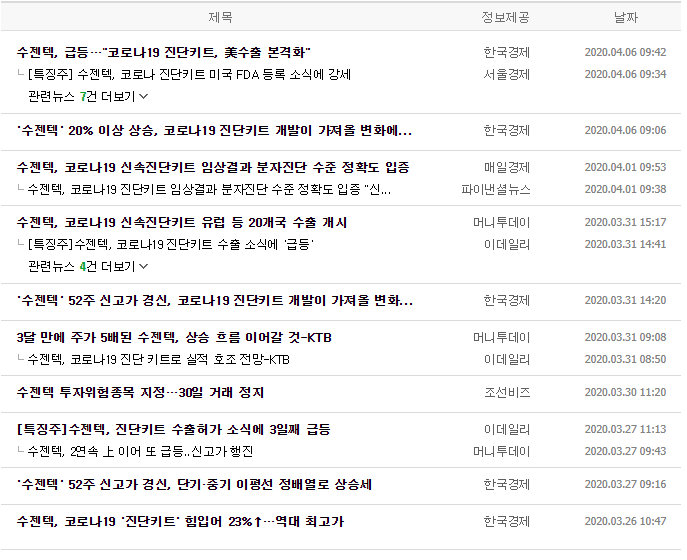 그러니 이 종목을 공략하신다면 제 의견은 무시해주시기 바랍니다. 그리고 수젠텍이나 상승할만한 종목을 제대로 알아보고 싶으시다면 저보단 전문적인 곳이 좋을 듯합니다.
