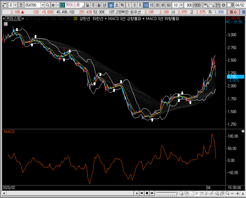 즉, 일봉 차트에서 밴드 상단을 뚫고 다시 밴드를 확장하는 키이스트의 주가가 보여야 하는데, 당장에는 이런 움직임을 섣불리 예측할 수 없는 상태이니 관망을 하는 것이 좋을 듯합니다.