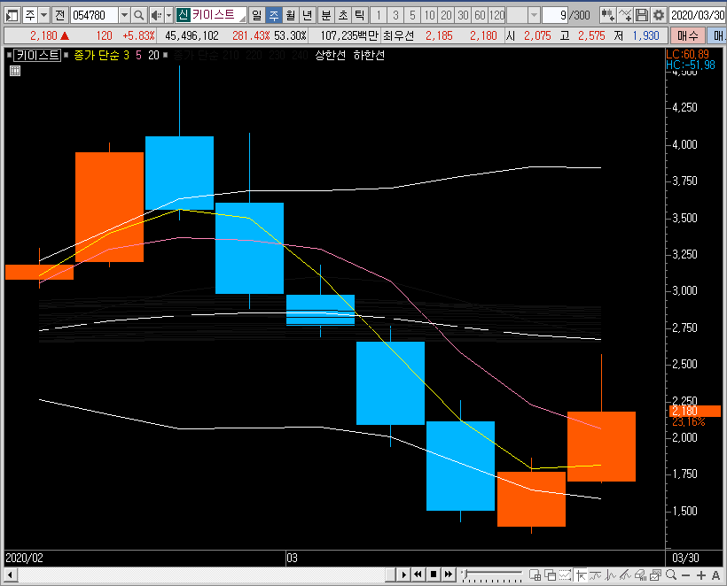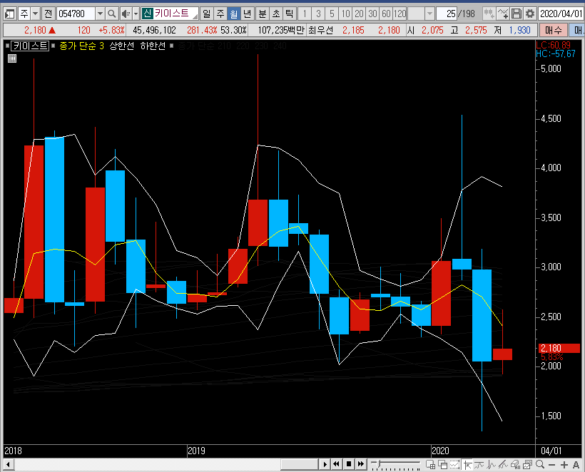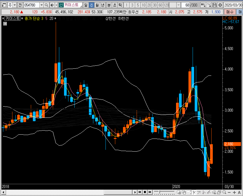 주봉차트로 넘어와서 키이스트의 주가를 보면 확장된 밴드의 하단을 건드린 뒤에 양봉으로 되돌림을 주는 모습을 볼 수 있는데, 변동성 패턴이라 이 상태로 중심선을 뚫고 지지한다면 밴드 상단까지도 열린 상태가 될 수 있을 것입니다.