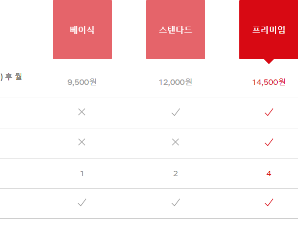 여러 가지 부분들을 고려했을 때 역시나 가장 좋은 방식은 프리미엄이라 할 수 있지만, 이 항목은 가장 부담스러운 넷플릭스의 가격이기도 해요. 이럴 땐 차선책이 한 가지 있습니다.
