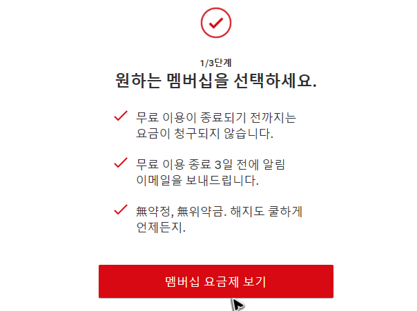 빈칸을 채우면 아래 그림과 같은 화면이 보일 거예요. 여기에서 빨간색 버튼을 한 번 더 눌러주면 넷플릭스의 가격을 바로바로 확인하실 수 있습니다. 이 부분은 공식 루트에서 안내되는 내용이니 정확하다고 할 수 있어요.