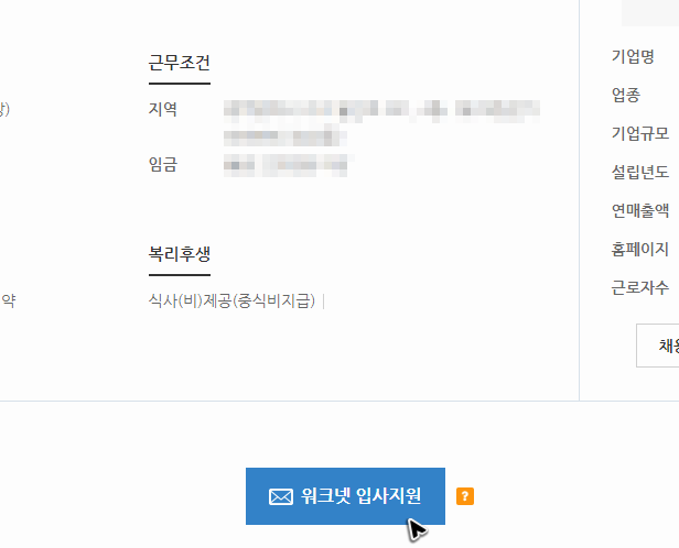 지원을 할 땐 벼룩시장 구인구직의 사이트에 있는 파란색 버튼을 클릭하고, 로그인을 한 뒤에 페이지에서 요구하는 정보들을 채워주시면 됩니다. 특별히 복잡하거나 어려운 부분은 없을 거예요.