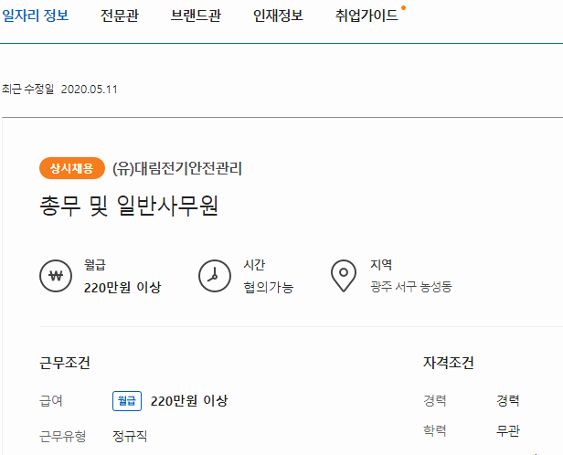 검색 결과에 나오는 각각의 항목을 클릭하면 벼룩시장 구인구직의 사이트에 등록되어 있는 일자리의 정보를 조금 더 세세하게 확인할 수 있고, 필요에 따라 바로 지원을 할 수도 있습니다.