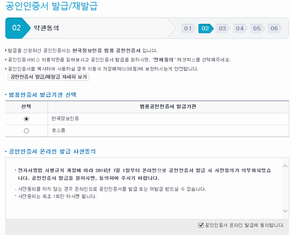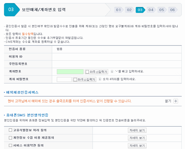 발급이나 재발급을 할 땐 총 여섯 단계를 농협의 공인인증센터에서 진행을 해주어야 하는데, 각각의 과정은 그냥 안내되는 정보를 살펴보고 빈칸을 채우는 것이 전부라서 제가 세세하게 설명할 부분이 없을 것 같아요.