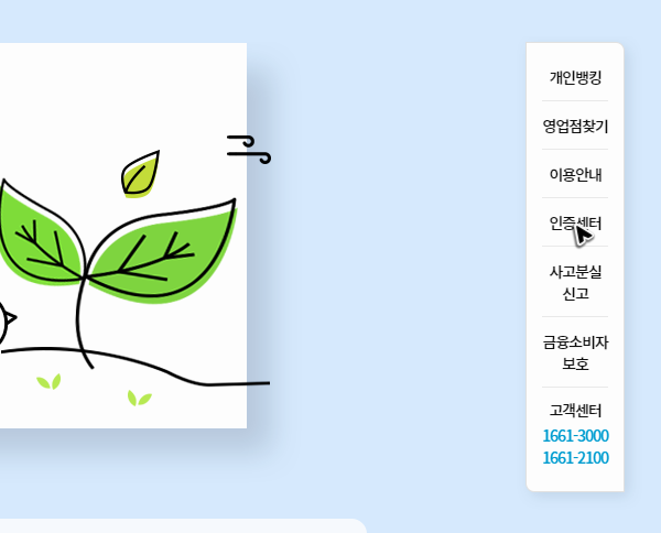 주소를 정확하게 입력해도 농협 공인인증의 센터가 바로 보이지는 않을 거예요. 여기에서 메뉴를 눌러야 하는데, 위쪽에 있는 버튼을 누르거나, 우측의 버튼을 누르면 됩니다.