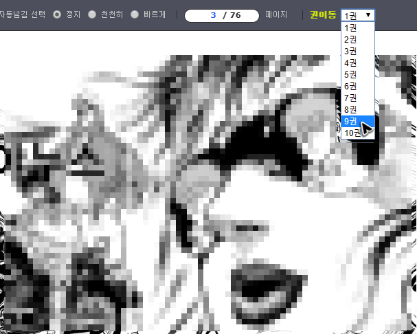드디어 무료만화를 보는 곳에서 그림을 보여줍니다. 이미지를 클릭하면서 다음 장으로 이동할 수 있고, 위쪽에 보이는 네비게이션 메뉴를 활용해서 다음장으로 이동하거나 다른권으로 이동하는 것이 가능해요.