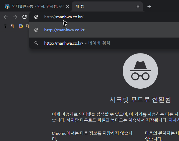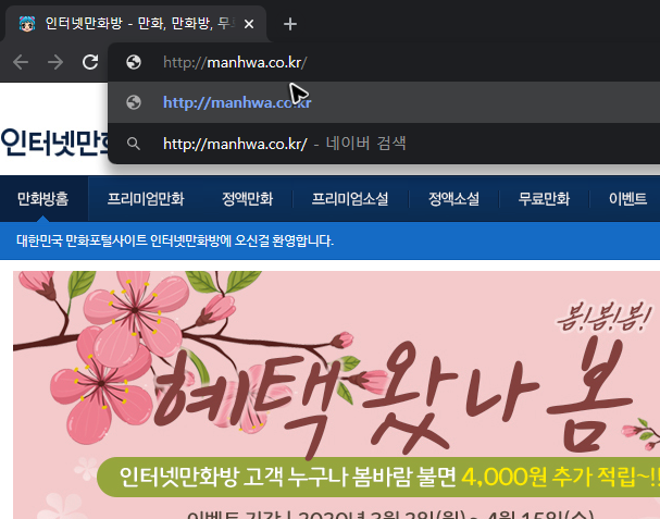 이번에는 조금 더 전문적이라 할 수 있는 무료만화를 보는 곳에 대해 얘기를 해볼까요. 이번에 주소창에 적어야 될 주소는 [manhwa.co.kr]입니다. 워낙 유명한 페이지라 이미 알고 계신 분들도 많으실 것 같아요.