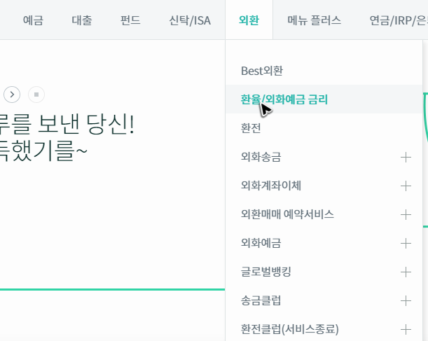 공식 사이트를 찾아가면 위쪽에 다양한 메뉴들이 보일 거예요. 우리는 하나은행 환율을 조회하기 위해서 찾아온 것이니, 다른 메뉴는 무시하고 그냥 외환 그룹에 있는 메뉴를 눌러주면 됩니다.