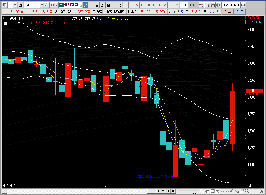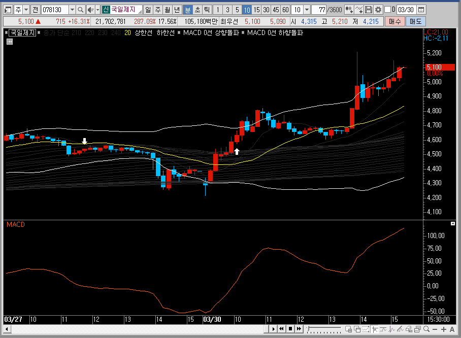 일봉차트에서 국일제지의 주가를 보면 상승대비 적당한 수준으로 조정이 들어온 상태인데, 여기에서 밴드 상단선까지 바로 달려간 뒤에 그대로 그물망까지 뚫어주는 모습을 보여준다면 진입해도 좋을 듯합니다.
