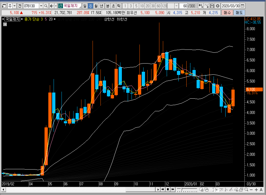 주봉차트로 넘어와서 국일제지의 주가를 보면 밴드를 아래쪽으로 확장한 뒤에 반등이 나오는 중입니다. 아직은 중심선을 뚫지 않은 모습이죠. 중심선을 어떻게 뚫어주느냐에 따라 밴드 위쪽으로 나갈지 아니면 재조정이 들어올지가 결정이 될 것 같습니다.
