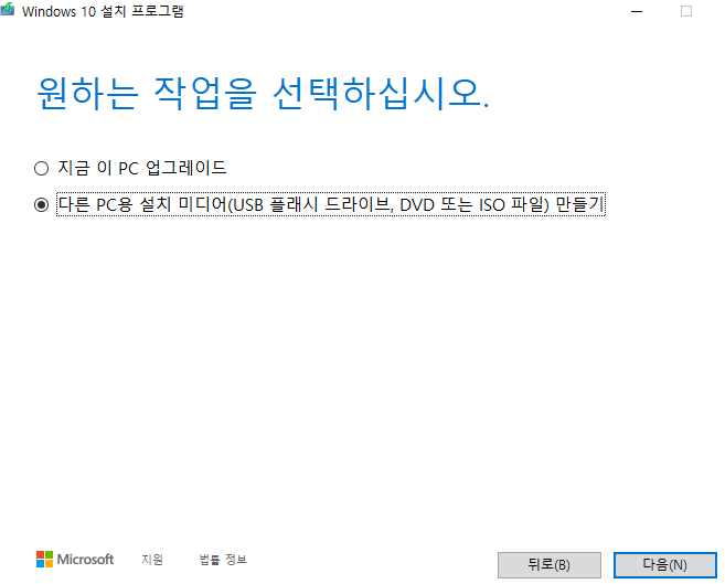 이어지는 화면에서는 두 번째 항목을 선택하고 다음을 눌러주세요. 그리고 언어와 버전 등을 선택하는 화면이 나오면, 여기에서는 따로 선택해도 되지만 그대로 윈도우10 usb 부팅디스크의 만들기를 해도 아무런 문제가 없습니다.