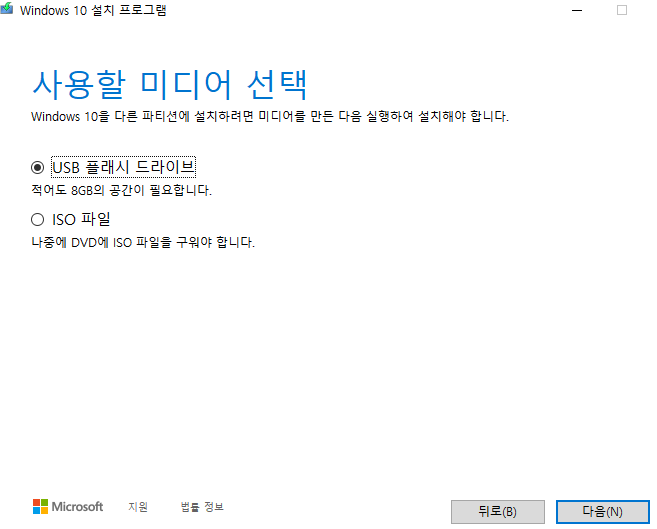 이제 미디어를 선택하는 부분이 나올 거예요. 저장 장치를 컴퓨터에 연결해둔 상태라면 플래시 드라이브를 선택한 뒤에 윈도우10 usb 부팅디스크의 만들기를 진행하면 됩니다. 이미지만 받을 수도 있는데 오류가 생기면 이 기능을 쓰면 돼요.