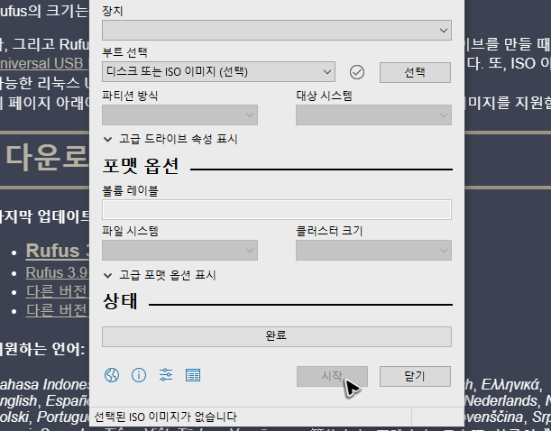 그리고 외부 저장 장치를 연결한 뒤에 시작을 눌러주세요. 완료라는 문구가 나오면 성공적으로 윈도우10 usb 부팅디스크 만들기를 한 것입니다.