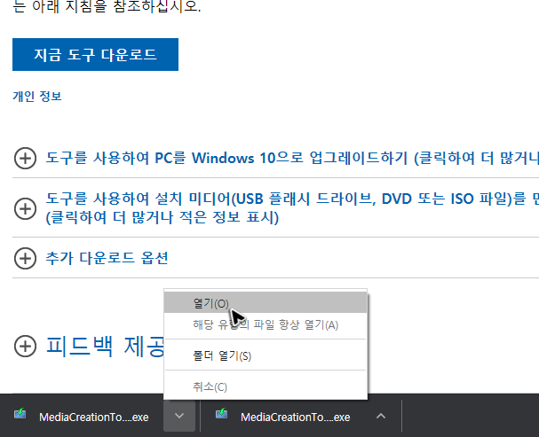 페이지에서 버튼을 누르고 파일을 받았다면, 받은 파일은 더블클릭으로 실행을 하면 됩니다. 저장 장치를 컴퓨터에 연결하고 실행하면 바로 윈도우10 usb 부팅디스크의 만들기를 시작할 수 있어요.