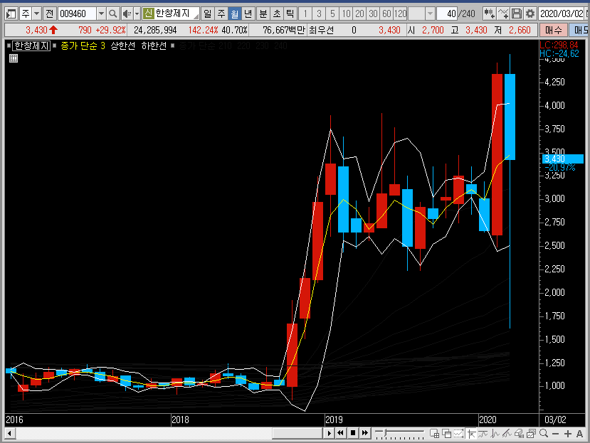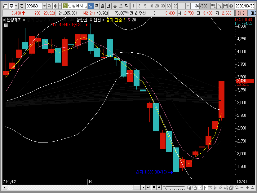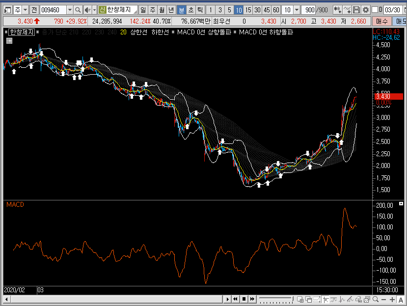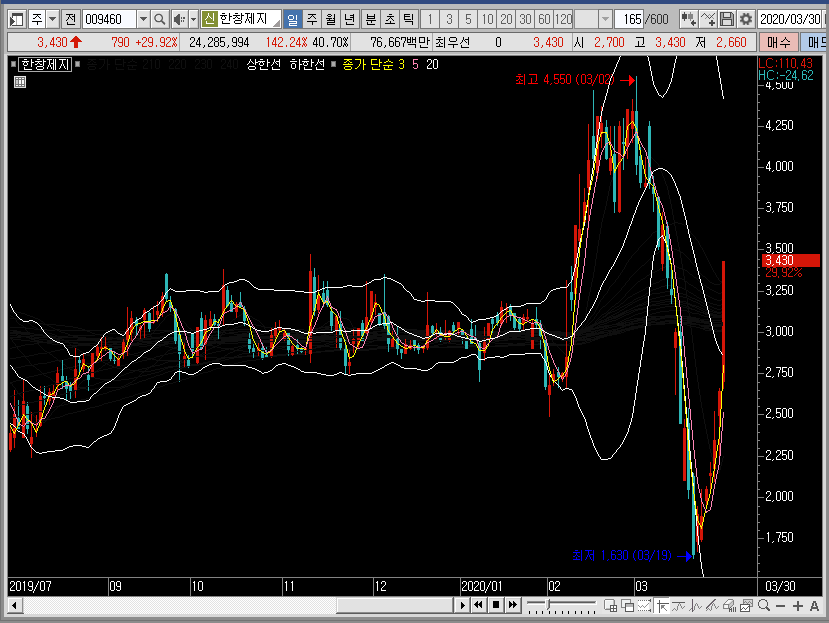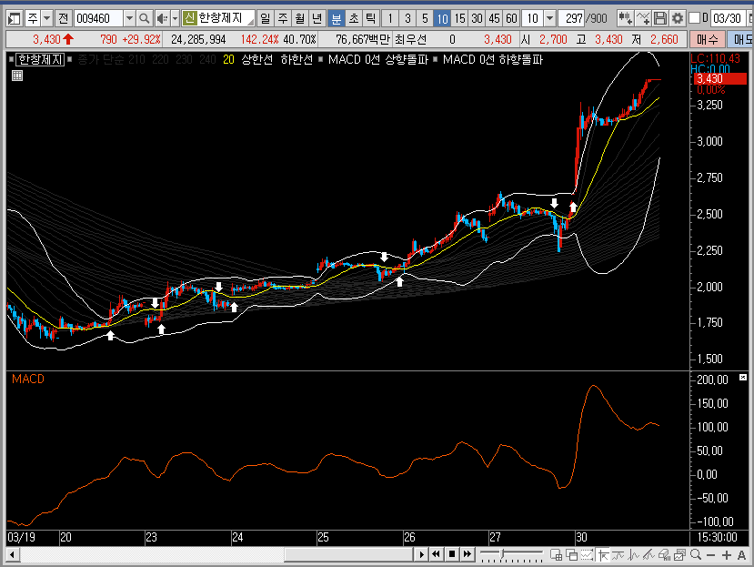 그래서 만약 선물차트라면 저는 밴드 하단에서 한창제지의 주가를 공략했을 것 같습니다. 하지만 여기는 선물이 아니죠? 그렇기 때문에 이미 많이 오른 종목이라는 것을 기억하고 소극적으로 대응하는 것이 더 좋은 선택이 아닐까 합니다.
