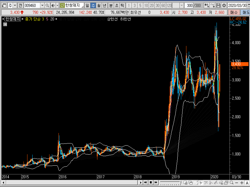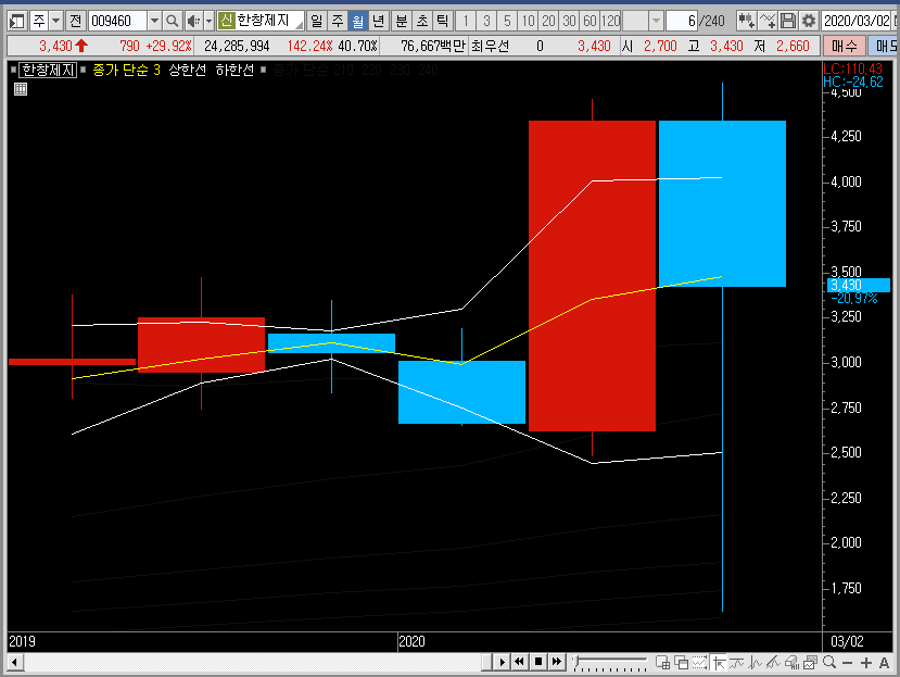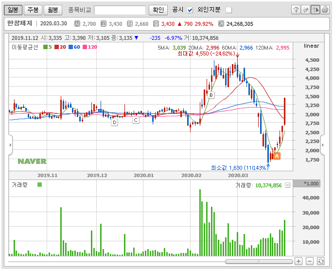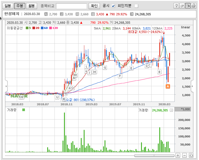 지금 이 종목이 어떤 테마에 얽혀있는지, 순매수가 들어온 이유는 뭔지, 실적은 어떤지 등등, 차트에 영향을 주는 재료에 대해선 제가 얘기를 해도 이미 다 알고 계실 것 같습니다. 그러니 저는 차트로 한창제지의 주가를 정리해보도록 하겠습니다.