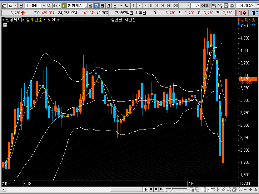 주봉차트를 보면 마찬가지로 밴드가 확장되어 있고, 아래쪽과 위쪽에서 각각 지지와 저항이 생기는 것을 볼 수 있습니다. 이 패턴을 유지한다면 한창제지의 주가는 상단선까지 닿을 수 있을 것이라 예상합니다.