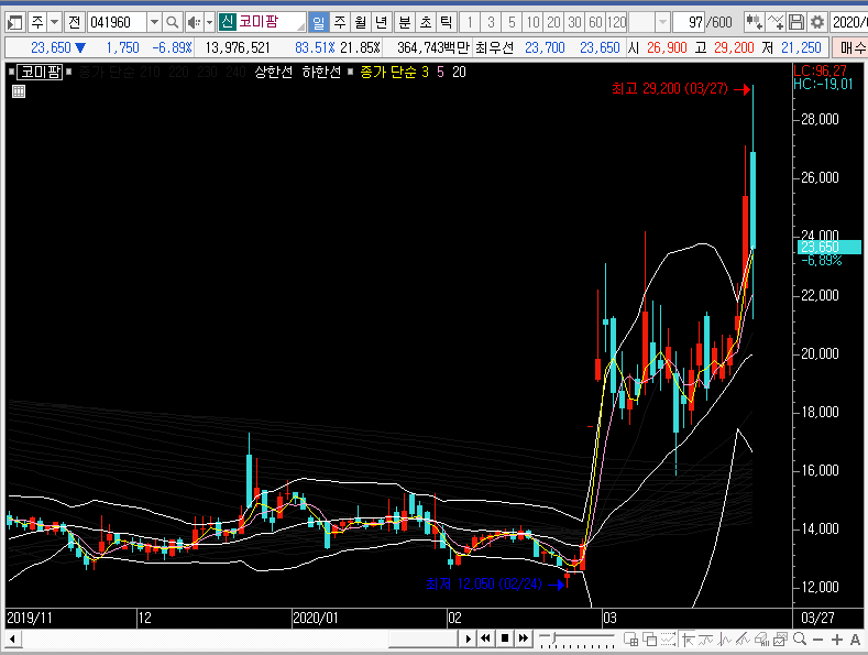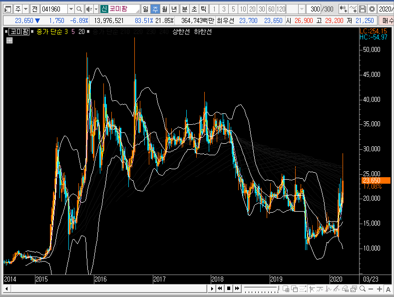 만약 코미팜의 주가가 추가적인 상승을 한다면 그물망 상단을 뚫은 뒤에 그 자리를 지지하는 모습을 보여줄 것이고, 그렇지 않다면 주봉차트의 중심선이나 밴드 하단까지 조정을 받을 것입니다.