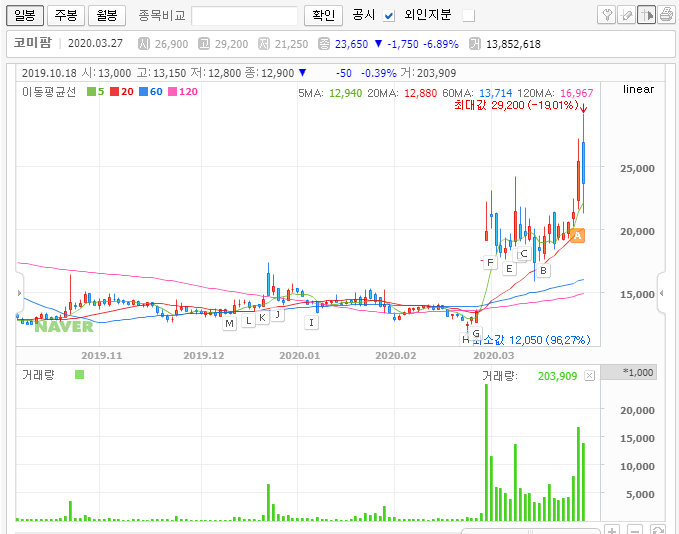 이 종목이 갖고 있는 재료, 차트의 움직임에 영향을 주는 소식들에 대해선 제가 하나씩 나열을 하더라도 이미 다 알고 계실 내용밖에 없습니다. 그래서 저는 차트로 코미팜의 주가를 살펴보도록 하겠습니다.
