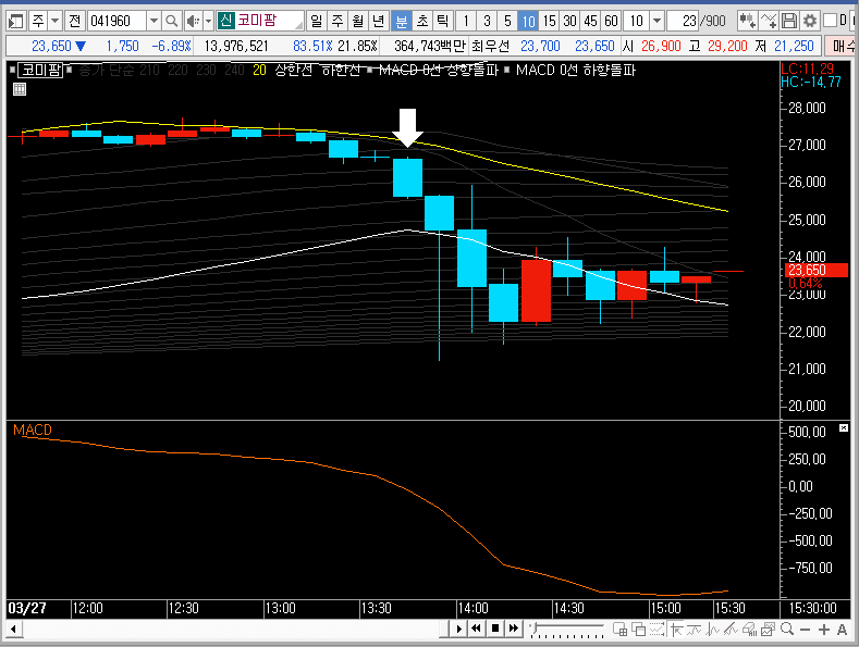 각설하고 주봉차트에서 코미팜의 주가를 살펴보면 그물망 상단에서 저항을 받고 윗꼬리를 길게 만드는 모습을 보여주고 있습니다. 그리고 지금까지의 상승을 하며 3일선과 5일선 눌림이 이미 들어온 적이 있습니다.