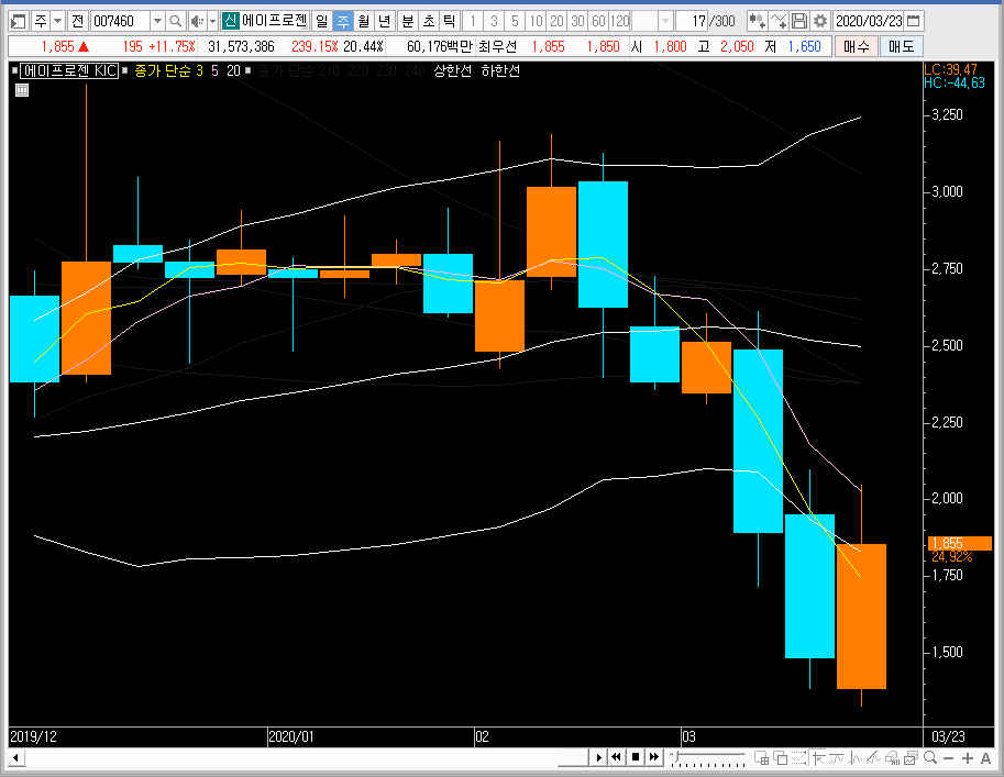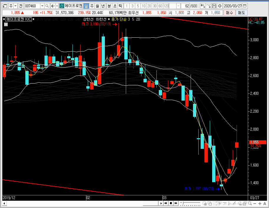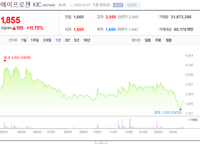 지금 이 종목이 반등을 준비하는 이유, 차트의 흐름에 영향을 줄 수 있는 원인은 제가 얘기를 하더라도 이미 다 알고 계실 내용들 밖에 없을 듯합니다. 그러니 차트를 보며 에이프로젠의 KIC 주가를 확인하도록 하겠습니다.
