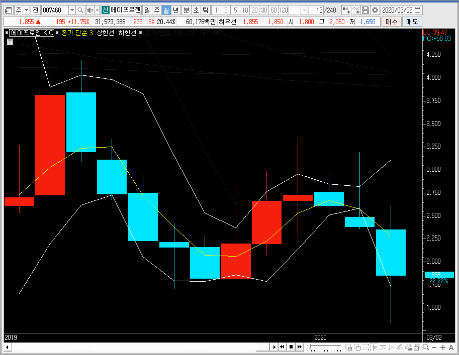 일단 월봉차트에서 에이프로젠 KIC의 주가를 보면 말 그대로 바닥에 있는데, 이 동네는 바닥 아래에 지하가 있을 수 있으니, 차트상 바닥이라는 이유로 덜컥 진입하고 모아갈 수는 없는 노릇이죠?