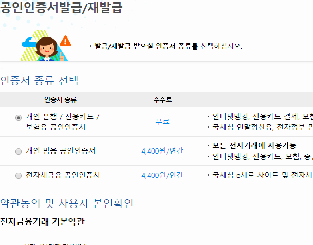 다만, 우리은행의 공인인증서에는 세 종류가 있는데, 어떤 종류를 선택해야 하는지 어려울 수 있어요. 그냥 수수료가 없는 항목을 선택하면 됩니다. 굳이 범용이 아니더라도 은행의 온라인 뱅킹을 하는데 큰 제한이 없어요.