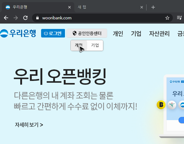 비밀스러운 은행의 사이트라서 아는 사람만 찾아갈 수 있는 곳이 아니죠? 검색하면 인터넷 뱅킹이 필요한 누구나 찾아갈 수 있습니다. 하지만 검색은 귀찮아요. 그러니 [wooribank.com]를 주소창에 적어서 우리은행의 공인인증서를 재발급하고 갱신을 해주세요.